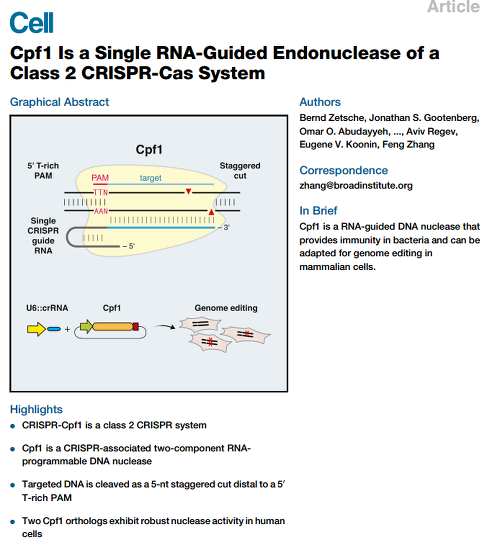 Cpf1 Is a Single RNA-Guided Endonuclease of a Class 2 CRISPR-Cas System