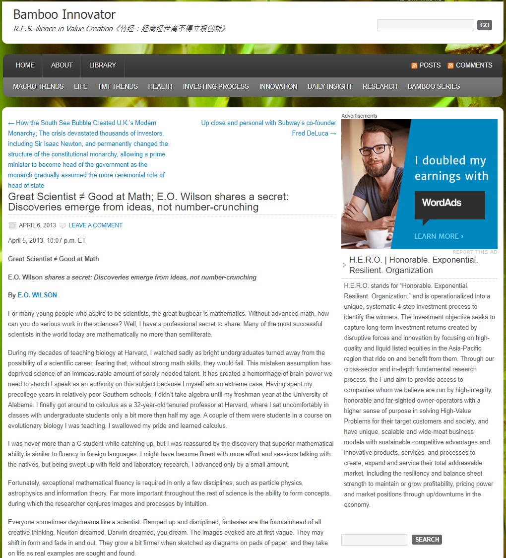 E.O. Wilson shares a secret: Discoveries emerge from ideas, not number-crunching.