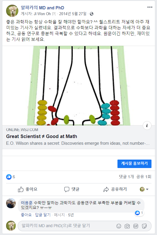 결과적으로 수학보다 과학을 대하는 자세가 더 중요하고, 공동 연구로 충분히 극복할 수 있다고 하네요.
