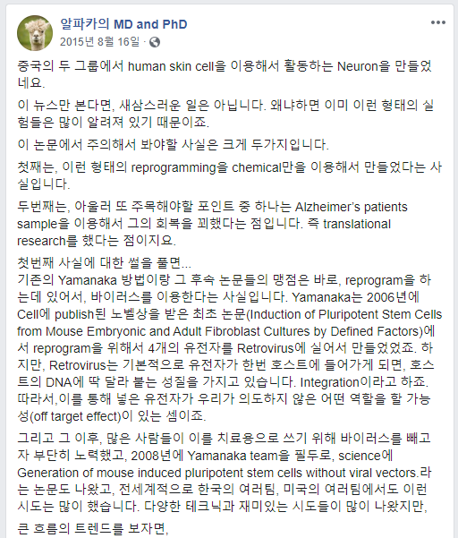 그리고 그 이후, 많은 사람들이 이를 치료용으로 쓰기 위해 바이러스를 빼고자 부단히 노력했고, 2008년에 Yamanaka team을 필두로, science에 Generation of mouse induced pluripotent stem cells without viral vectors.라는 논문도 나왔고, 전세계적으로 한국의 여러팀, 미국의 여러팀에서도 이런 시도는 많이 했습니다. 다양한 테크닉과 재미있는 시도들이 많이 나왔지만,