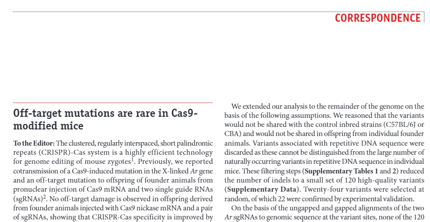 그래서, 영국의 한 그룹에서 한 일이 뭐냐 하면, 지난 번에 CRISPR-Cas9으로 만든 쥐를 whole genome sequencing 해 버린 것입니다. 즉, 우리가 타겟한 곳 말고 또 다른 부분이 문제 생긴 곳이 있는지 전체 유전자 레벨에서 한 번 살펴 보니깐.. 생각했던 것보다 적더라.. (rare라고 표현한 부분이 중요합니다.) 아주 없지는 않았다는 것이죠.
