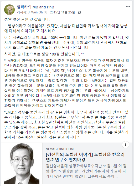 "LMB의 경우를 보면 우리의 갈 길은 명확하다. 먼저 과학적 능력과 안목이 있는 리더를 기용하고, 그가 최소 10년은 근무하면서 특정 분야를 집중 육성할 수 있도록 해주고, 최소한 5년 단위로 예산을 지원하고, 선진국 수준의 실험 인프라를 갖춰 주고, 논문 발표 실적에 의한 계량 평가보다는 연구주제의 과학적 가치를 가늠하는 정성평가 시스템을 인정해 주는 것이다. 이를 실천하기 위해서 많은 예산이 필요한 것은 결코 아니다."