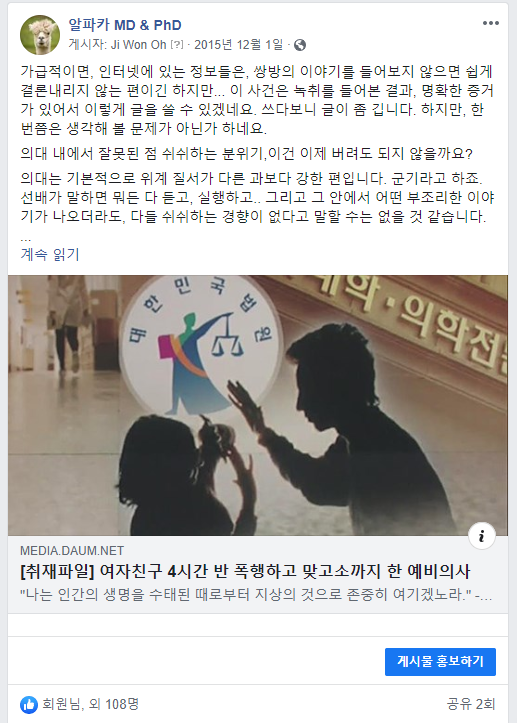 그렇기 때문에, 의사 사회에서 이 일뿐만 아니라, 그 이후를 더 소중하게 다뤄줘야 하고, 2차적으로 피해가 가지 않게 신경을 써줘야 합니다.