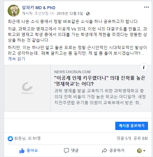 비록 제가 의대를 나오기는 했지만,저는 제 스스로를 과학자라고 생각하고, 이공계라고 생각하는데...이런 글을 볼 때마다, 정말 하나만 알고, 둘은 모르는 바보같은 생각같아서 너무나도 안타깝습니다. 의대 Vs 이공계 이렇게 이분법적으로 나누어서, 자기 테두리 안에 뛰어난 인재들이 오면 좋을 것이라고 생각하실텐데.. 거국적으로, 그리고 장기적으로 이 사안을 바라보면, 이 사안은 국가 인재가 적절한 기회를 부여받지 못해서 한 분야의 발전을 저해하는 행위이고, 궁극적으로 앞 날이 창창한, 국가 인재에 대한 배임 행위입니다. 그리고, 개인의 선택권을 아주 강하게 침해하는 구시대적인 발상입니다.