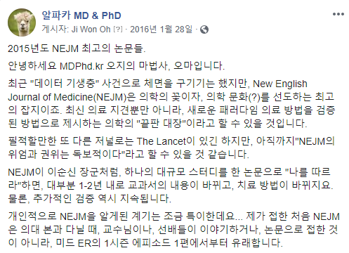 최근 "데이터 기생충" 사건으로 체면을 구기기는 했지만, New English Journal of Medicine(NEJM)은 의학의 꽃이자, 의학 문화(?)를 선도하는 최고의 잡지이죠. 최신 의료 지견뿐만 아니라, 새로운 패러다임 의료 방법을 검증된 방법으로 제시하는 의학의 "끝판 대장"이라고 할 수 있을 것입니다.