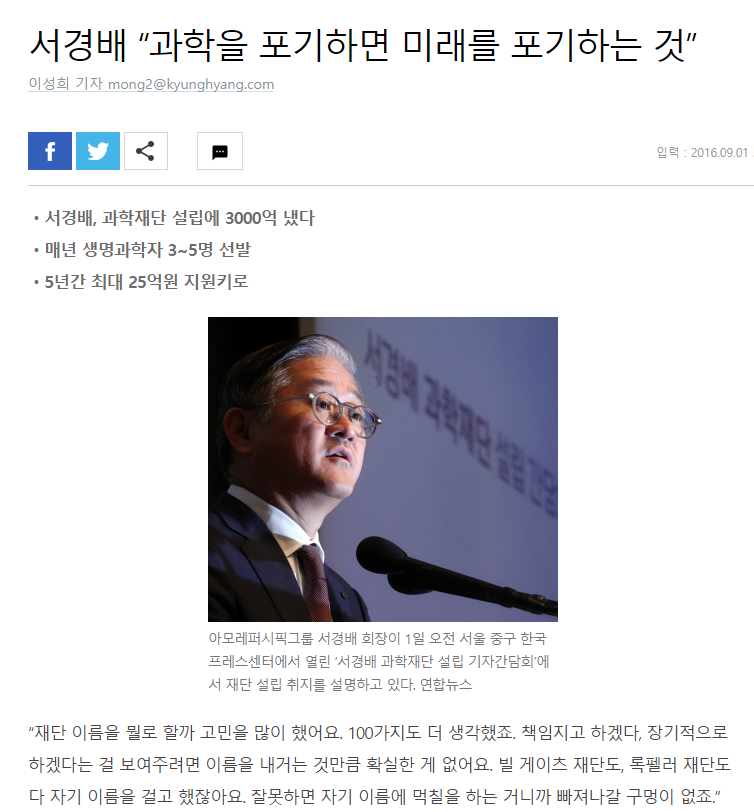또한, 서경배 회장의 인터뷰에서도, 그리고 삼성 재단에서도 나타난 다행스러운 일은, 이제 짬짬이 연구비를 주는 것이 아니라, 공식적인 위원회를 거쳐서, 재단 주인의 의지와는 독립적으로 연구비를 수여하고, 의사 결정을 하는 토대가 서서히 마련되고 있다는 사실입니다. 이 역시 아주 큰 혁신이며, 권장해야할 사항일 것입니다.
