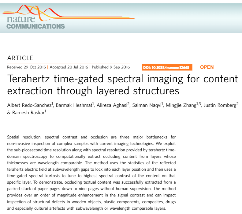 참고로, 이 연구는, 겹쳐진 종이에서 각 장에 있는 알파벳을 유추하고 찍어내기 위해서 terahertz electric field 를 이용했습니다. 그 파장에서 반사되는 형태를 다각도로 분석한 결과 각 장에 있는 알파벳을 명확히 구분할 수 있었다고 합니다. 총 9장의 종이가 이용되었고 동영상에도 명확히 구분되네요.
