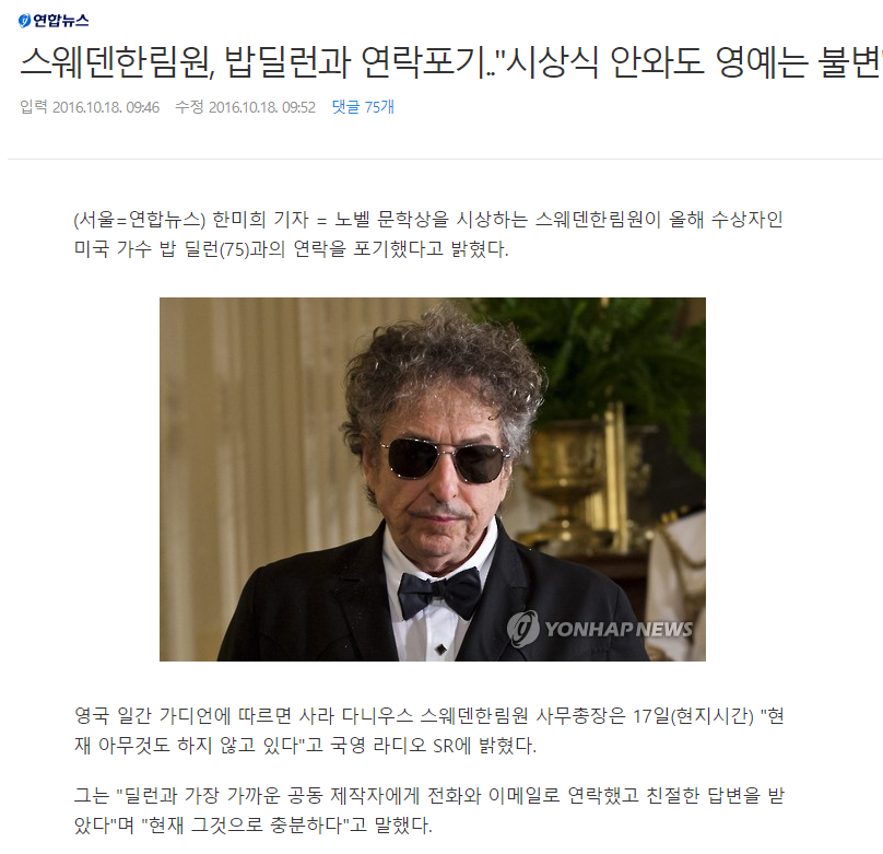 사람들은 밥 딜런이 수상을 받을 것인가 말것인가, 혹은 시상식에 올 것인가 말것인가에 초점을 두고 있지만, 저는 이를 대하는 스웨덴 한림원의 자세를 칭찬하고 싶습니다.