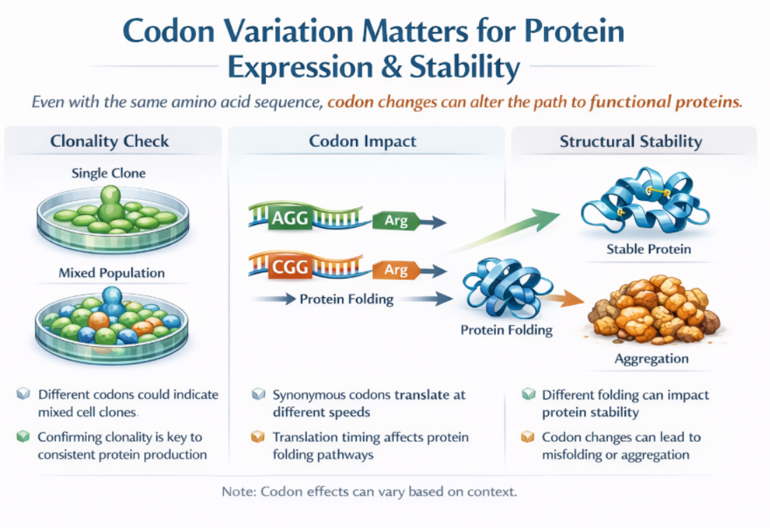 즉, codon 변이는 단백질 품질 이전에 세포주의 정체성을 검증하는 도구입니다.